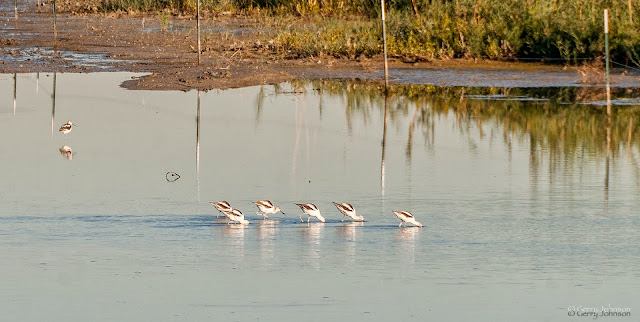 The American Avocets and the Barn Swallows were both out in force today, along with a number of unidentified flying ducks! And the Great Blue Heron was warming himself in the morning sun - I've not see this before. Makes me want to reach out with a long finger and tickle his tummy!!