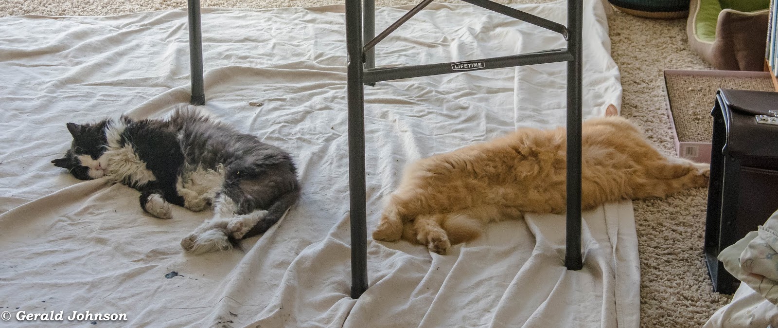 Often Leo (black and white) and Fuzzy (orange) do not get along - but this day they did as they both napped under the table.