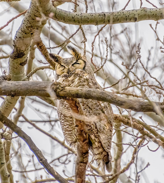 Finally found the Great Horned Owl at the ranch again. This time a bit more photographable, but still challenging.